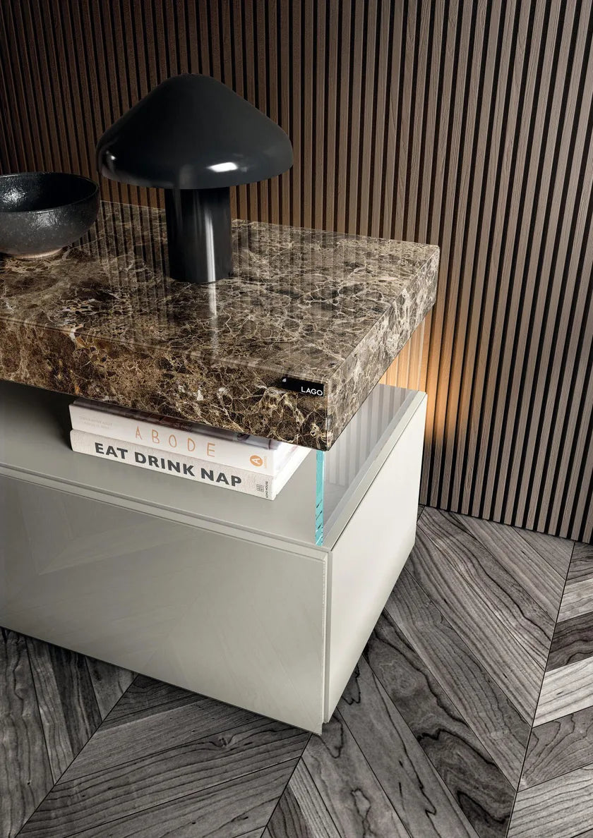 The Air Bedside Table 2681 by Lago is a stunning example of weightless design, featuring a sleek storage top that appears to float on crystal-clear tempered glass legs. Part of Lago’s iconic Air collection, this modern nightstand brings a sense of lightness and sophistication to any bedroom. Crafted in Italy with premium materials and available in customizable finishes, the Air 2681 is perfect for minimalist interiors that value elegance, innovation, and functional beauty.