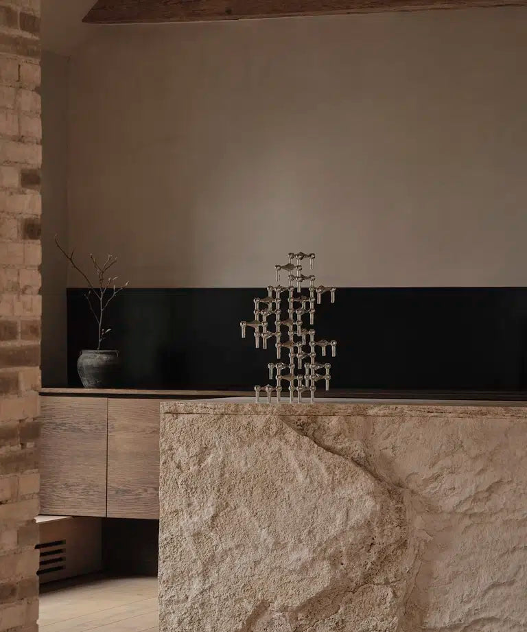 Available in a refined range of finishes, the candleholder adapts effortlessly to both classic and contemporary interiors. Display it as a singular statement or build dramatic clusters that play with light, shadow, and reflection. Compatible with traditional taper candles or STOFF LED candles, it balances function and artistry in perfect harmony.