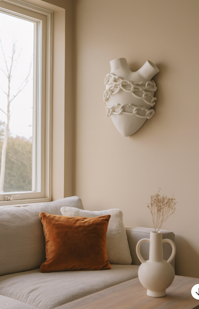 Chains by Elica Studio is a porcelain wall heart that powerfully symbolizes emotional restraint and inner struggle. Featuring finely sculpted chains wrapped around a delicate heart form, this piece evokes themes of tension, vulnerability, and resilience. Part of the expressive Wall Heart collection and handcrafted in Italy, Chains is available at Attiko Casa ā a striking addition to any curated art wall.