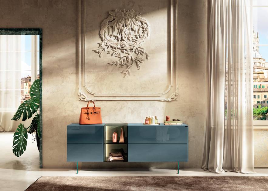 Born from the versatility of the 36e8 module, this dresser creates formally pure volumes that are fully customizable in size, finish, and color. Its clean architectural lines and suspended design offer a refined solution for contemporary bedrooms — elegant, functional, and adaptable to evolving styles.
