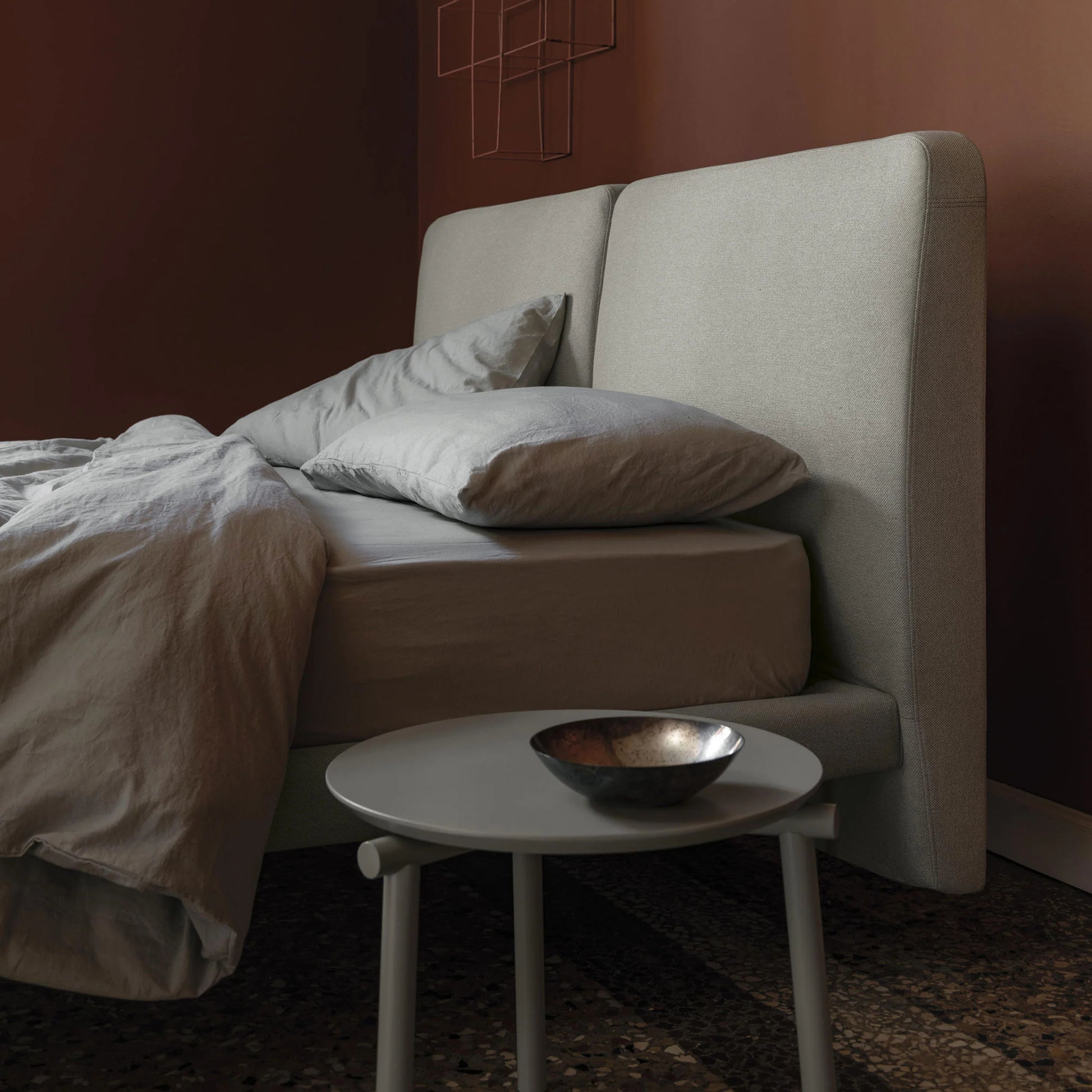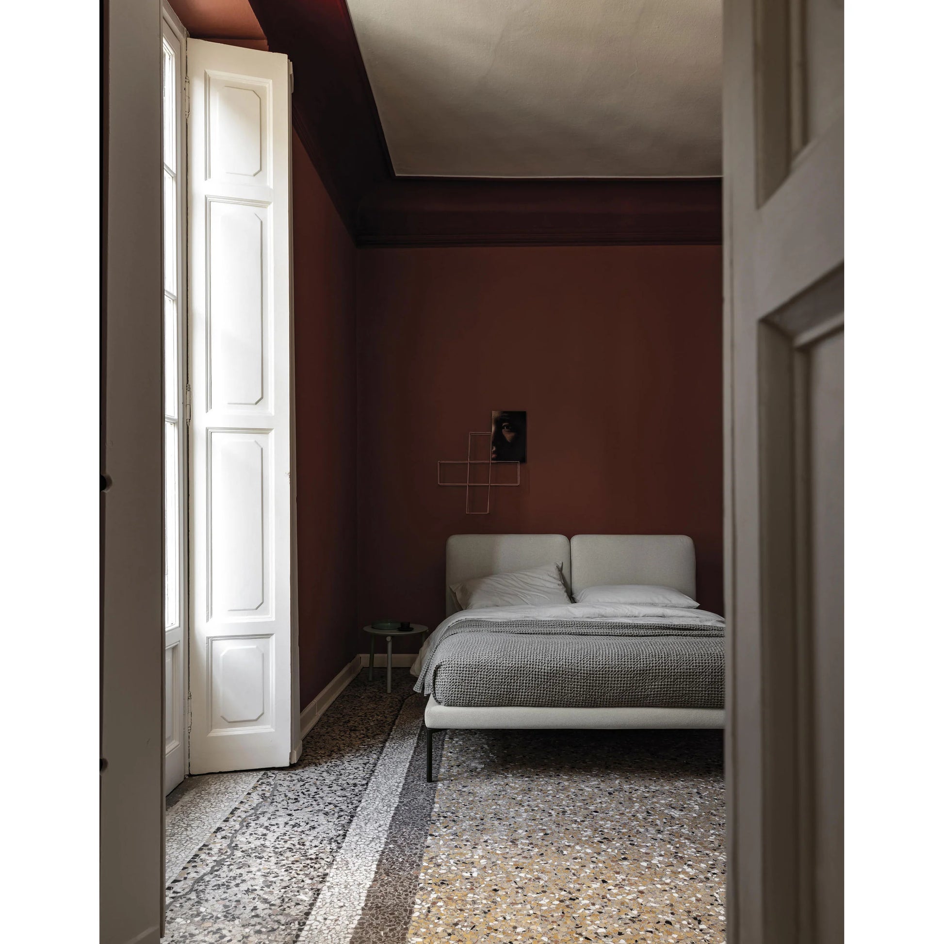 Designed to evoke understated luxury, the Taq29 bed pairs soft geometry with refined detailing. The fully upholstered frame features a distinctive split headboard, gently rounded edges, and discreet metal feet that elevate the silhouette with subtle elegance. Crafted in Italy, it includes an orthopedic slatted base with a powder-coated metal frame and beech wood staves for lasting comfort and support.