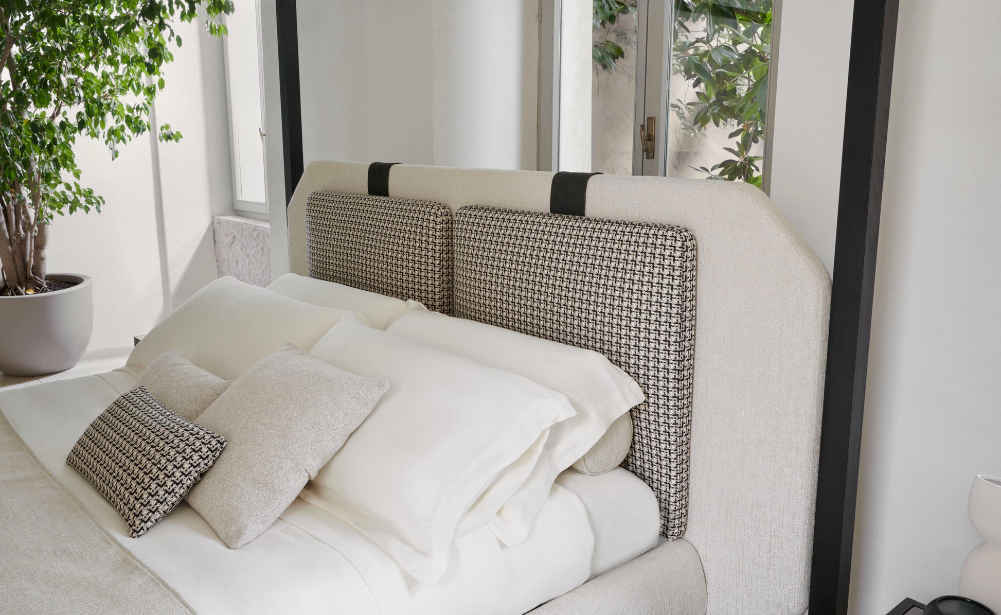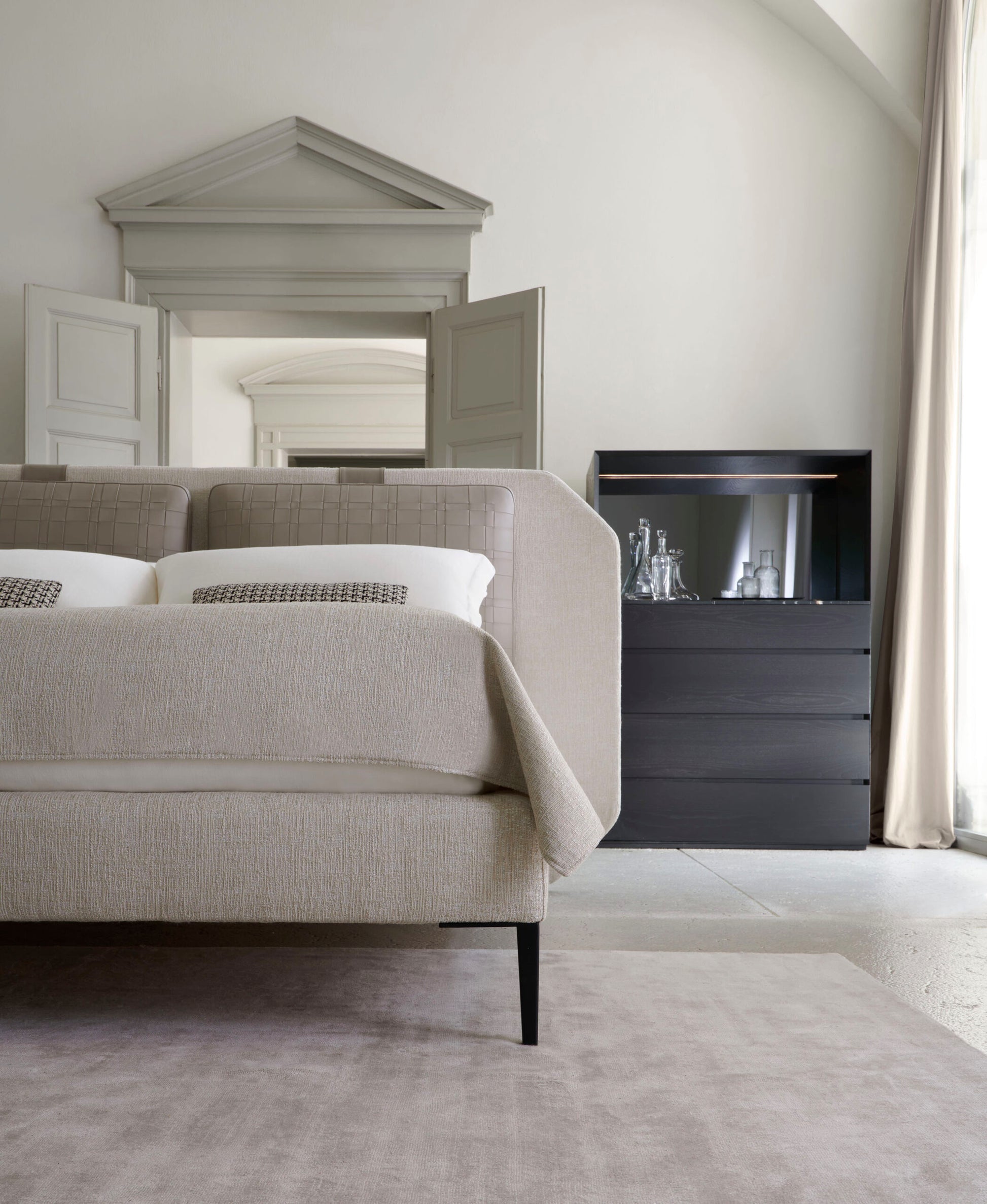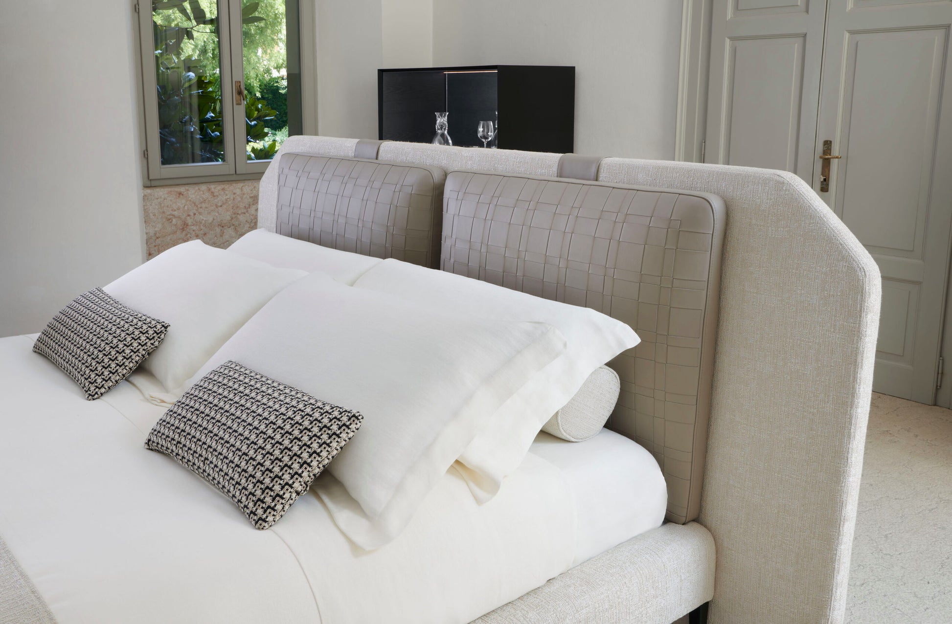 The KARL bed, designed by architect Joe Garzone, stands as a centerpiece in any bedroom. Its front shoulder pillows showcase sophisticated handwoven detailing, exemplifying the finest Italian artisanal techniques.