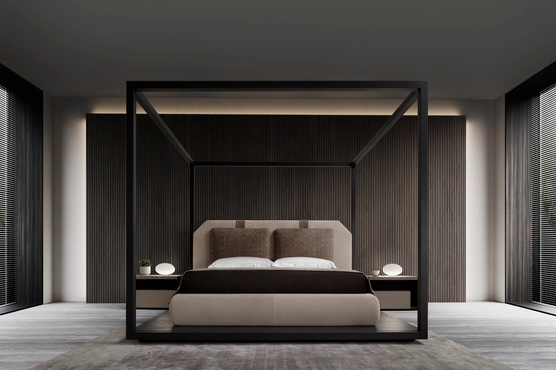 Available in multiple configurations, KARL can feature a high frame with painted metal feet, a solid wood base, or a container bed frame for added functionality. Upholstery options include leatherāpaired with woven leather pillowsāor fabric, with pillows in smooth fabric or optional woven leather. For a dramatic architectural statement, KARL is also offered with a canopy structure in solid wood, available in a variety of painted finishes.