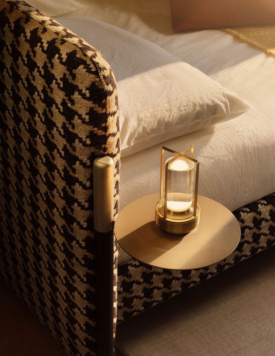 The higher footboard embraces the mattress, creating a bold architectural presence that feels protective and intimate. Optional accessories — such as the swivel tray (also available in a double version) or brass caps — further enhance its functionality and visual identity. The collection extends to coordinated pieces including a beauty desk, bench, poufs, and armchair, all designed with the same thoughtful balance.