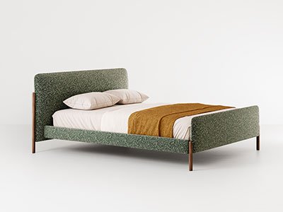 A refined balance between wood and fabric defines the Flag Bed with Footboard. Its essential structure highlights the dialogue between materials, where every detail serves both aesthetics and function. Solid walnut feet elevate the form with lightness, while the upholstery follows the silhouette with seamless continuity.