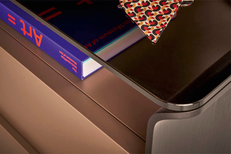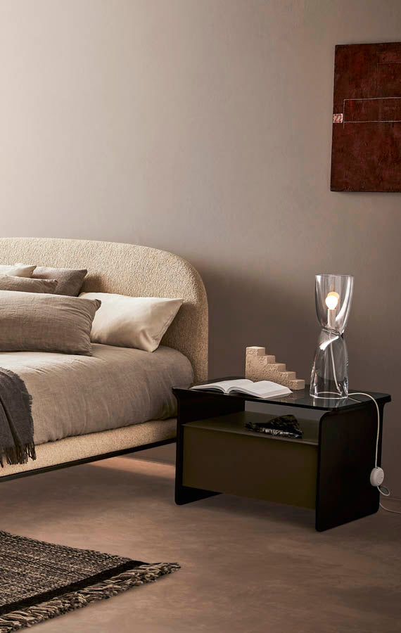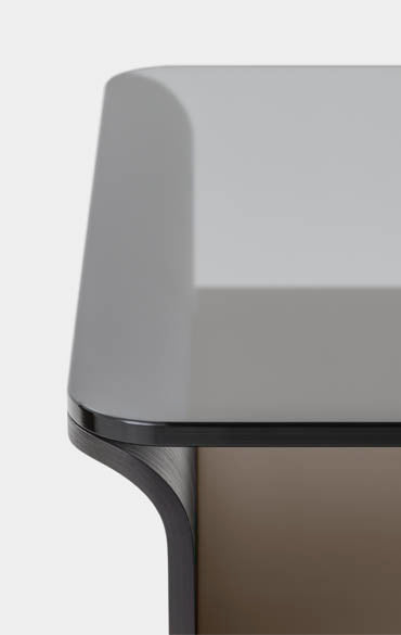 The 2W256 Sideboard combines sturdiness with soft, graceful lines, celebrating the harmonious interplay of materials and forms. Its glass top in Col. Piombo extends over a wooden structure finished in Borgogna 522, gently curving outwards to support the surface. A subtle empty space between the top and drawers enhances functionality and creates a sense of lightness, while mirroring the gap between the central body and the floor for a balanced, sculptural effect. Perfect for contemporary living spaces, the 2W256 merges elegance with practical storage.