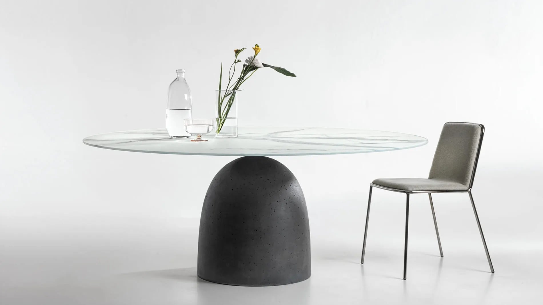The Janeiro Table by Lago Design merges solidity with ethereal elegance, drawing inspiration from Rio de Janeiro’s iconic Sugarloaf Mountain. This dining table’s distinctive base, crafted from natural concrete, showcases a sculptural dome shape that balances effortlessly with a polished XGlass statuario top. The contrast between the solid concrete base and the delicate transparency of the glass surface creates a striking blend of modernity and sophistication. Available in multiple shapes and finishes, the Janeiro table adapts seamlessly to any luxurious interior. The innovative steel structure hidden within the base ensures a stable connection between the top and base, making it both a functional and visually captivating piece. Perfect for those seeking refined design and architectural influence in their furnishings.