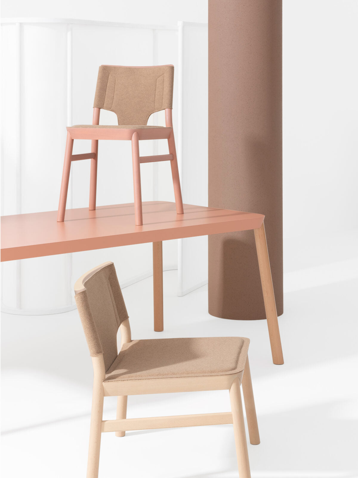 Blending hand-crafted charm with modern refinement, the Marimba Chair is ideal for elevated residential and hospitality interiors. For an alternative tactile and visual experience, the chair is also available in a felt-upholstered version, offering versatility without compromising its distinctive design identity.