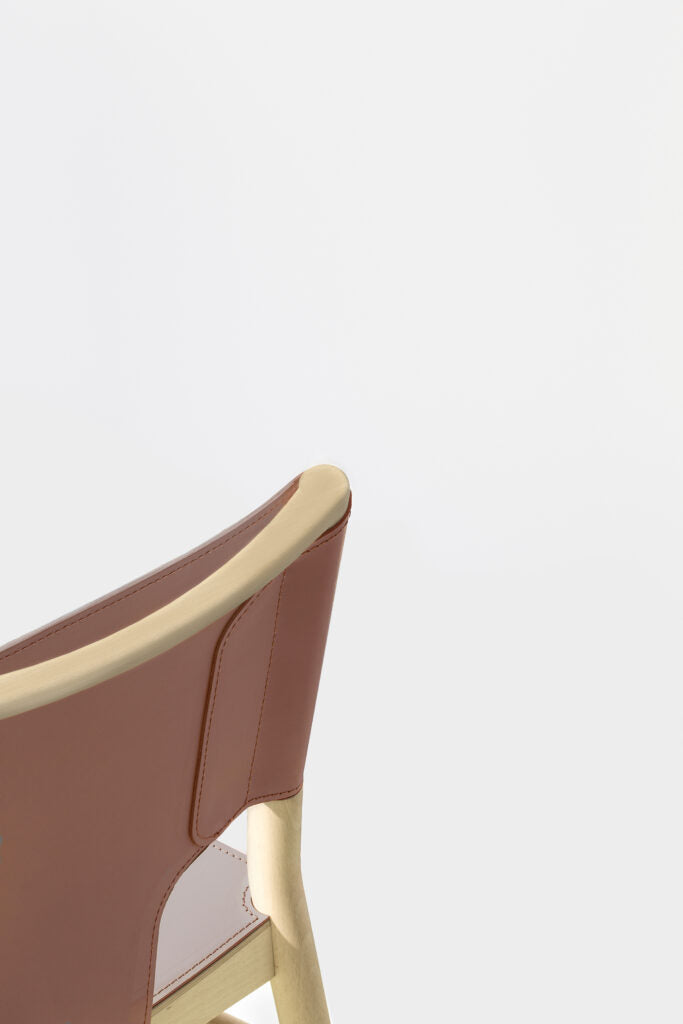 The finely shaped wooden seat pairs seamlessly with the angled back legs, which extend and subtly tilt to support a sculpted leather backrest. This detail evokes the elegance and precision of high-end leather goods, giving the chair a warm, artisanal character while maintaining a clean, contemporary aesthetic.