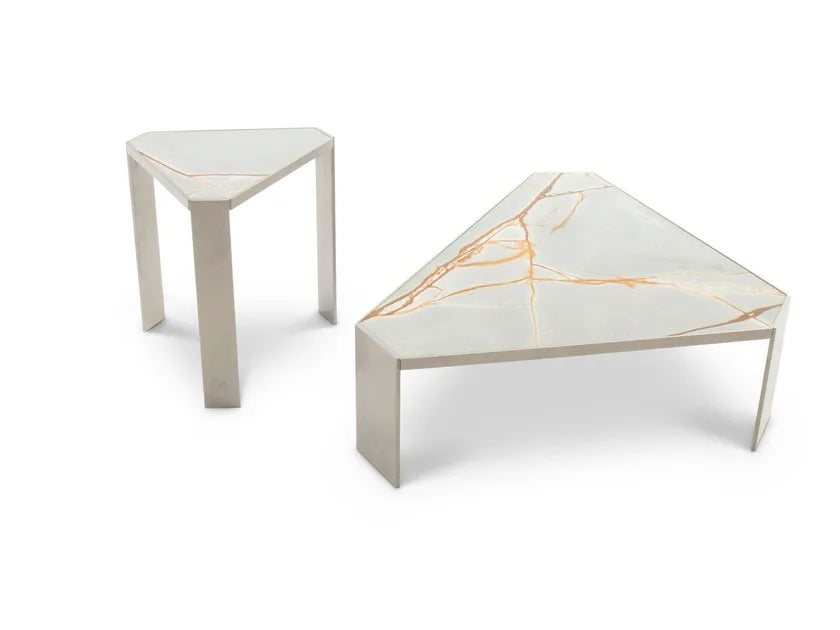 Its triangular plane seems to float, creating a sense of dynamism and visual lightness that transforms any living space. Carefully selected marbles in vibrant tones meet contrasting materials, bringing texture, depth, and a touch of modern Italian luxury to your home.