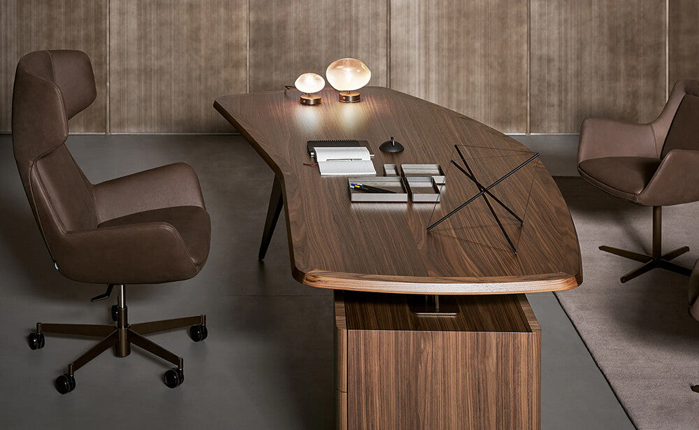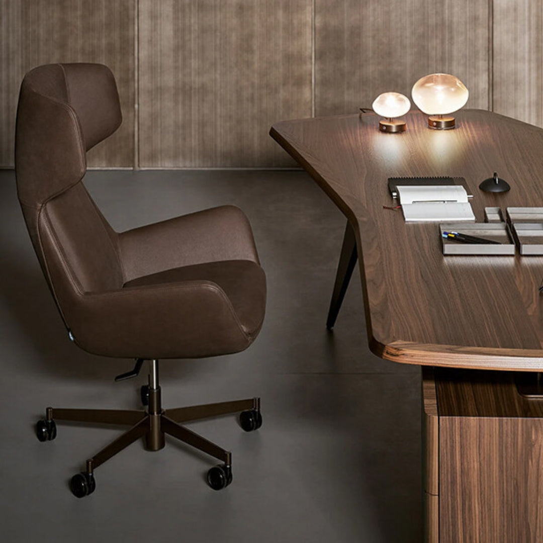 The Newton Office Armchair exudes executive sophistication with its bronze base and 100% real leather upholstery. Designed for all-encompassing comfort, its high backrest and wide shell provide essential support for prolonged use in professional settings. Perfect for executive and presidential offices, Newton is available in a single-material leather version or a dual-covering option with a fabric seat and leather front cushions. The swivel base with five wheels ensures smooth mobility. Pair it with the Newton Low Office Armchair for a cohesive office setup or use it as a statement piece in modern workspaces.