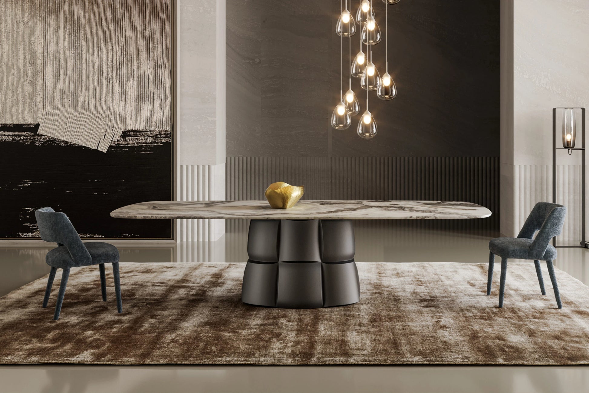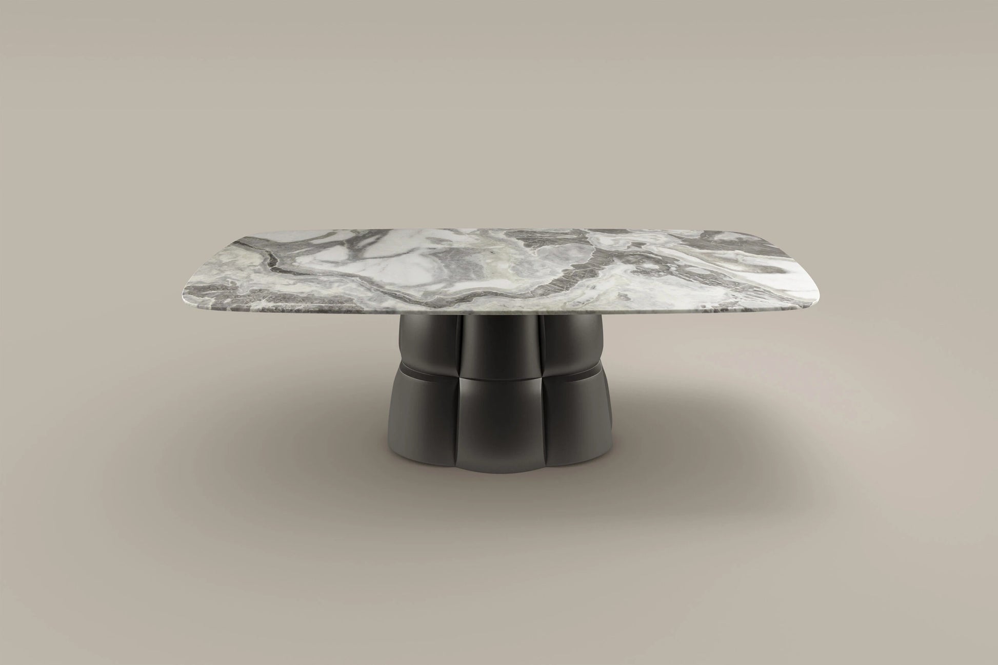The Palazzo Dining Table draws inspiration from Florentine Renaissance architecture, combining strength and elegance in a contemporary form. Its base, crafted from high-density polyurethane, echoes the massive stone blocks of historic facades, while remaining light and visually striking.
