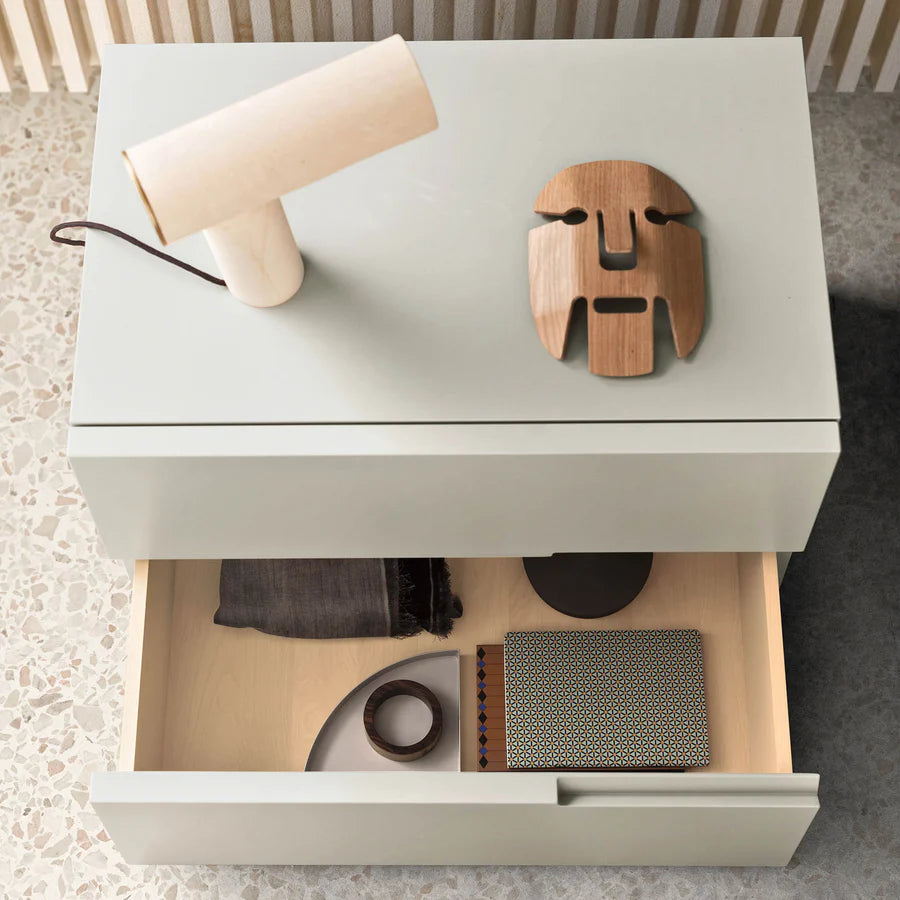 With its subtle design and refined detailing, the Segno Bedside Table introduces a fresh, contemporary accent to the bedroom. Its defining feature is the linear handle carved directly from the exceptionally thick front, creating a clean architectural gesture. When aligned — or mirrored — the handles form a rhythmic sequence of horizontal “marks,” adding quiet character to the space.