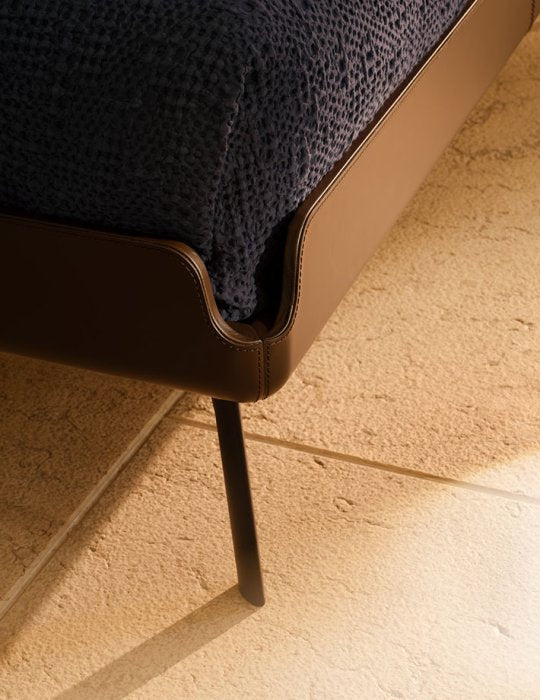 The leather upholstery, tailored with couture-like precision, enhances its sculptural silhouette and elevates the bed into a precious object defined by craftsmanship. Every stitch and detail is carefully considered to deliver both visual refinement and tactile pleasure.