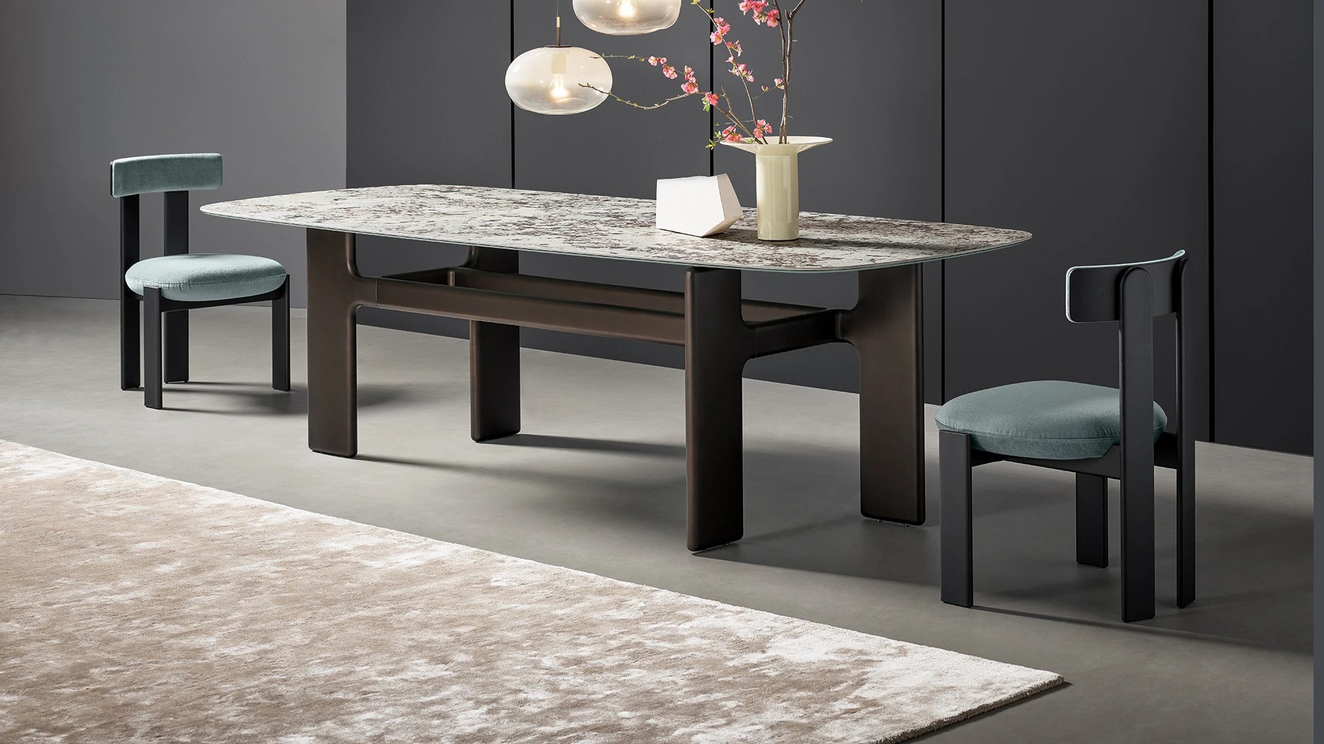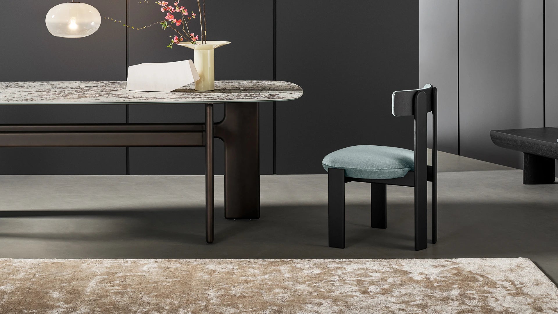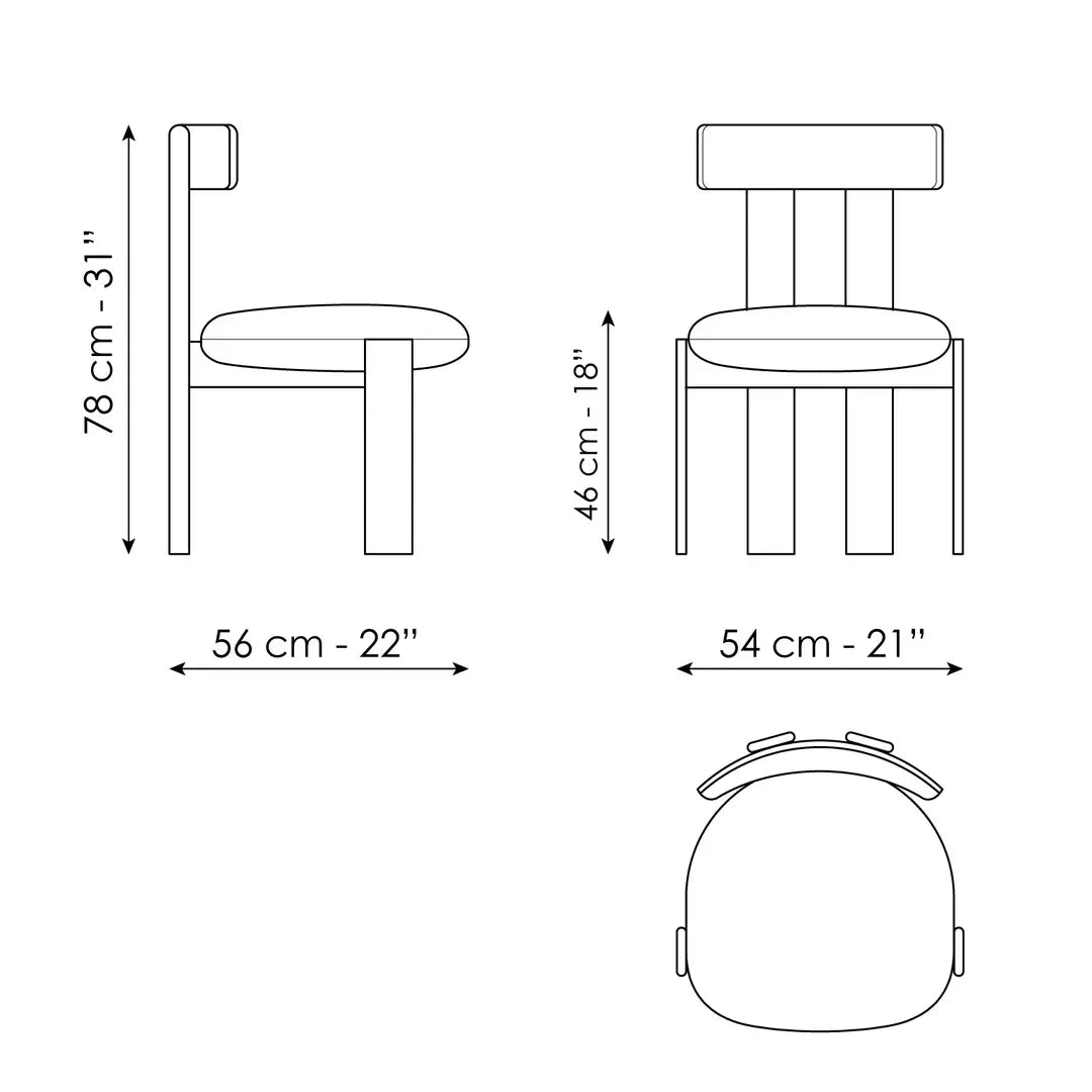 The rear legs, finished with gently rounded ends, establish a subtle, graphic dialogue with the backrest, completing a design that is both sculptural and inviting. Placed around a dining table, the Pi Chair becomes the focal point of the space, bringing distinctive character and contemporary elegance.