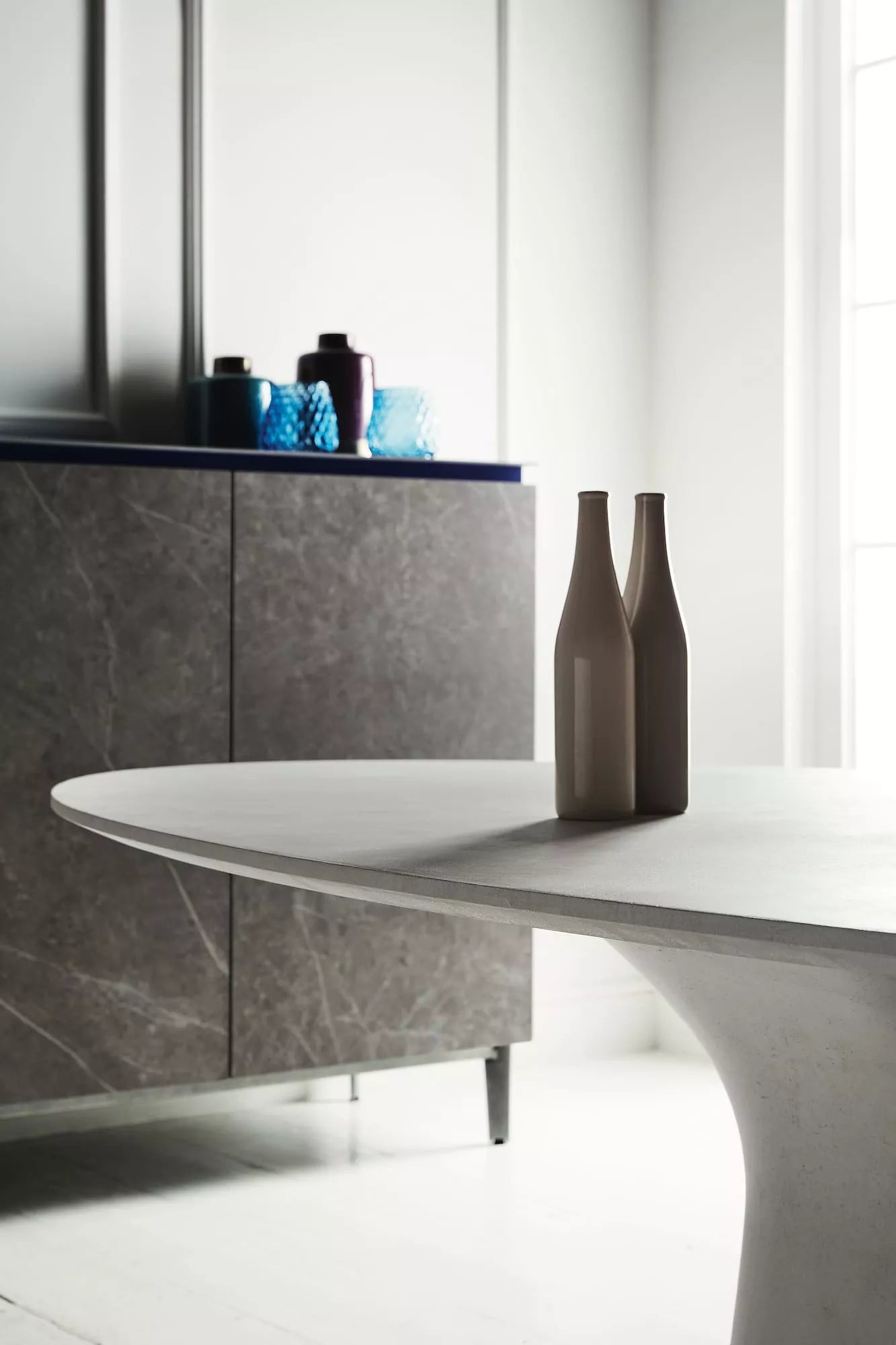 This dining table adapts effortlessly to your lifestyle. Available fixed or with extensions, it features a solid concrete base for stability and presence.