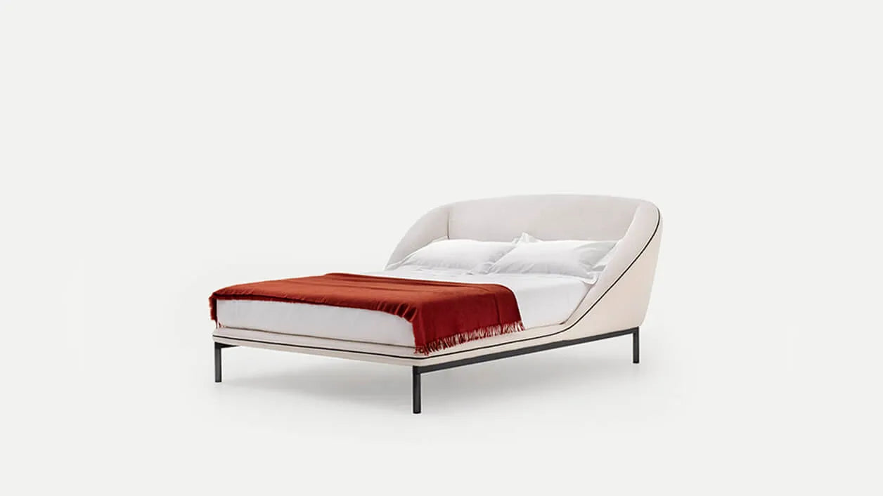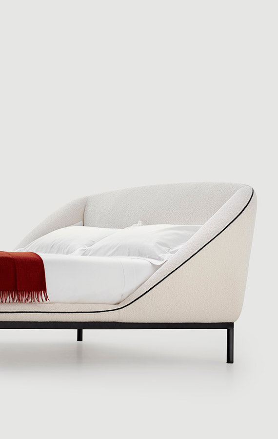 A tribute to rest, the Domenica bed envelops you in a warm, protective embrace. Its flowing, continuous silhouette creates a safe, intimate corner, perfect for relaxing, reading, or reclining. The exposed zip transforms a functional element into a refined design detail, while the gently widening contour curves downward in a graceful diagonal, evoking shelter and comfort. The metal base adds a floating effect, enhancing the bed’s lightness and visual elegance. Optional underbed storage is available for added practicality.