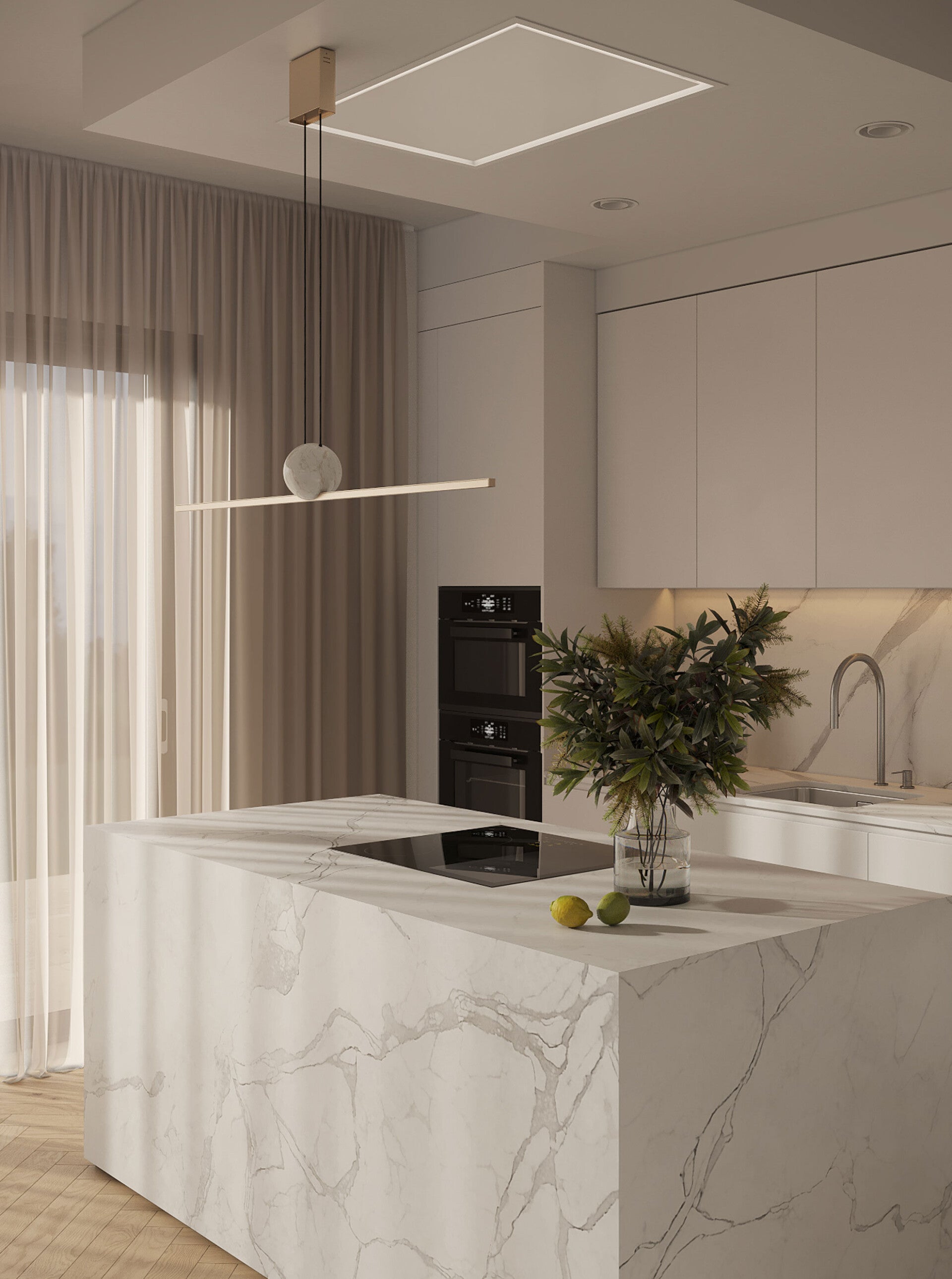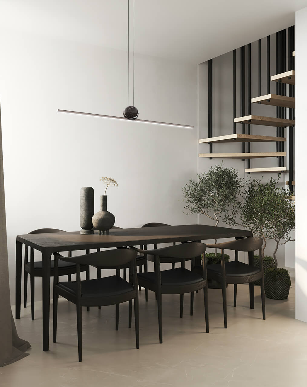 The Regolo Suspension Lamp transforms minimalism into an art of refined luxury. A sleek aluminum bar forms a precise geometric silhouette, while a spherical decorative element in Calacatta Gold or Black Marquinia marble introduces a tactile, sculptural accent. The combination of subtle lines and luxurious materials creates a sophisticated focal point in any interior.