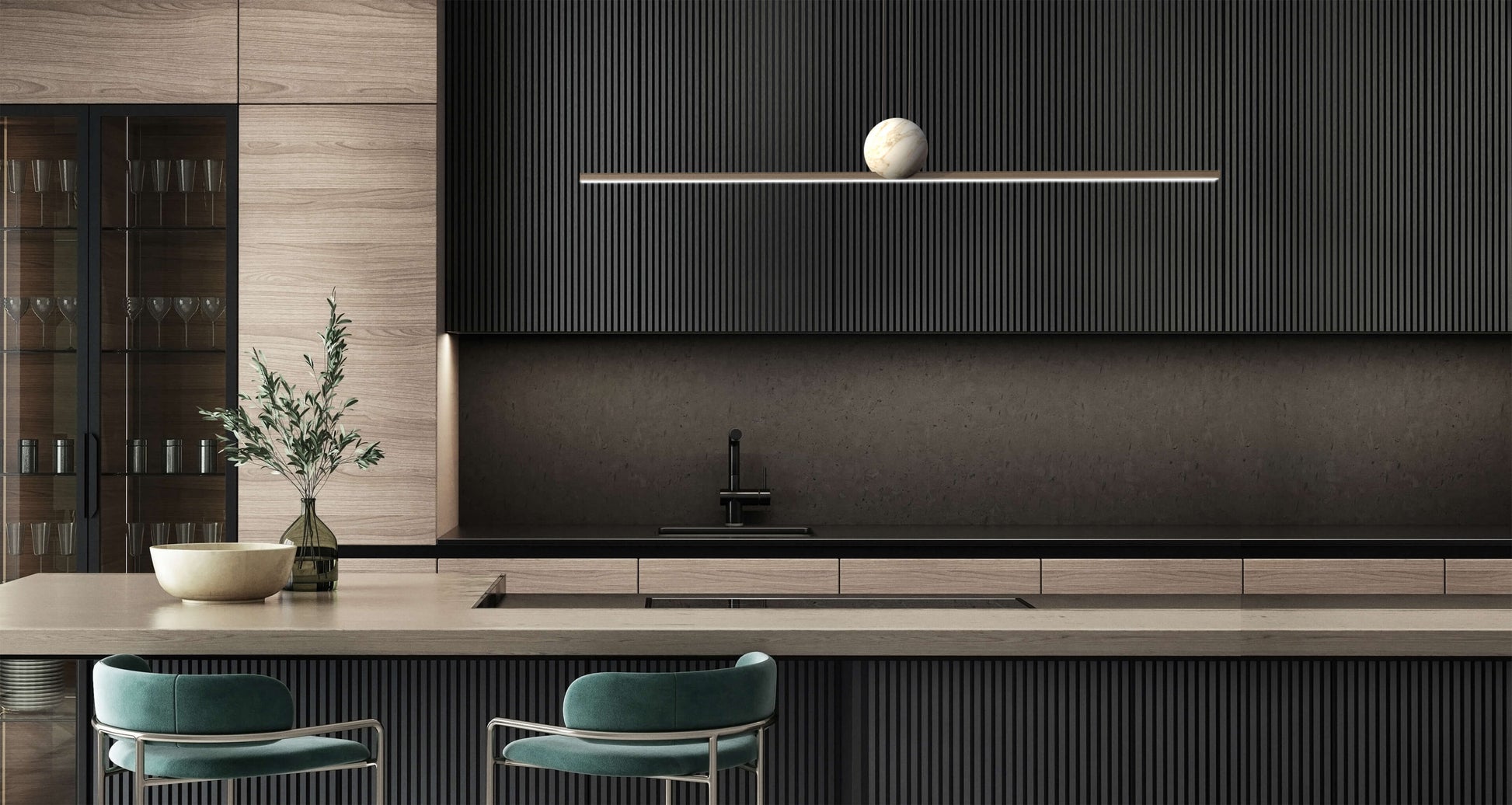 Available with a metal diffuser in matt black, matt champagne, or warm grey, Regolo casts a soft, atmospheric light, merging functionality with design mastery. Perfect for modern living and dining spaces, it balances minimal geometry with opulent details, elevating both style and ambiance.