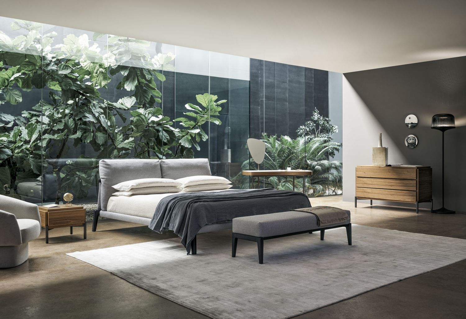 Kriss is a modern luxury bed that celebrates the harmony between soft fabrics and the timeless solidity of wood. The bed’s wooden structure becomes a defining design element, while the generously padded cushions of the headrest provide extra comfort. A study in contrast and elegance, the Kriss bed balances sophistication with warmth, creating a welcoming and exclusive aesthetic. The collection also includes a coordinating bench, completing a refined bedroom ensemble.