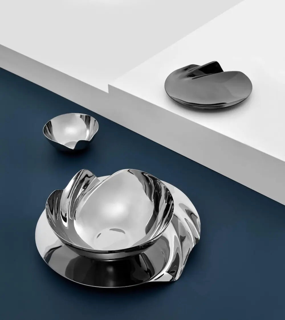 The Serenity Platter by Zaha Hadid Design is a captivating stainless steel centerpiece that transforms your tabletop with its fluid, undulating form. Inspired by natural ripples and Zaha Hadid’s signature architectural lines, the mirrored, polished surface creates dynamic reflections that elevate any interior. Available in multiple finishes—polished silver, black PVD, gold, and rose gold, this sculptural platter offers both visual drama and practical stability.