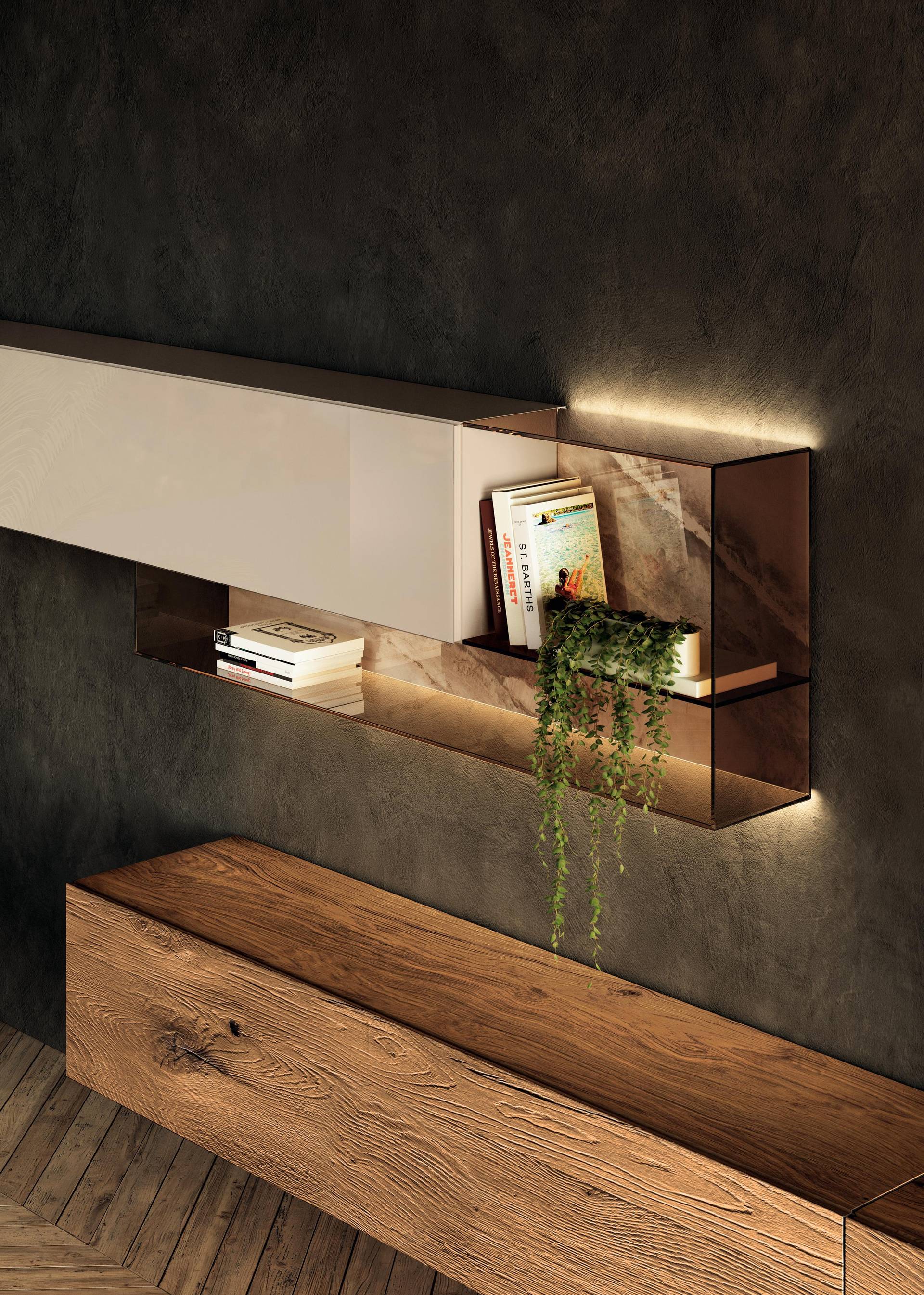 Its clean lines, precise 45° aluminium filigree, and lacquered interiors reflect exceptional craftsmanship, while the combination of closed and open units—crafted in polished Havana lacquer, smoked glass, and Onice Grigio finishes—creates a dynamic, visually engaging feature wall. The 36e8 Wall Unit is as functional as it is artistic, offering modular versatility without compromising style.