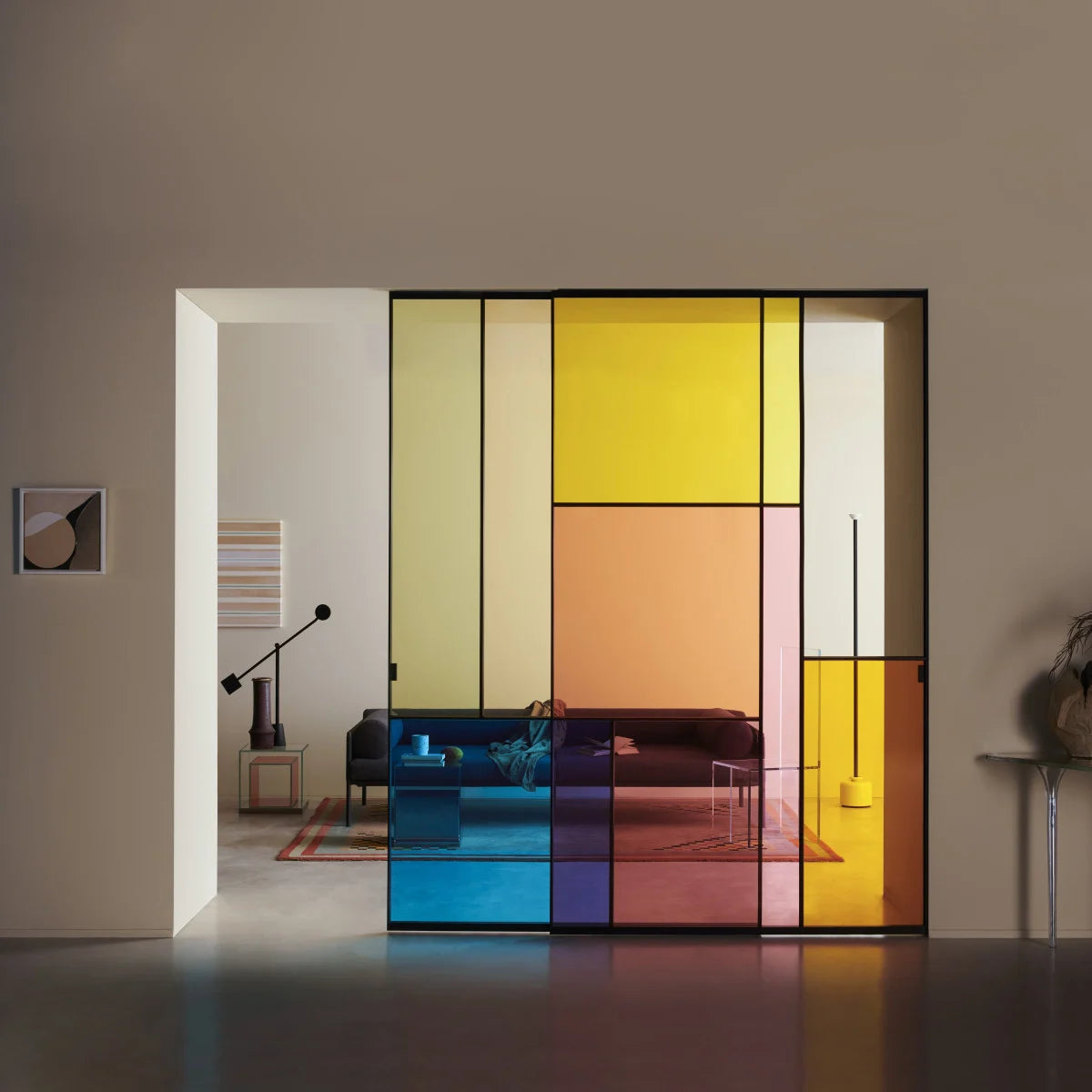 The Sherazade Slide Patchwork door combines elegance with meticulous craftsmanship. Its surface is divided into four panels, each offering the option to use different types of glass—either 6 mm tempered monolithic or 3+3 mm laminated glass. These panels are seamlessly fitted with a gasket and housed within aluminum profiles, available in five stylish finishes. The door's glass options come in a wide range of finishes, all certified for safety in compliance with ANSI Z97.1 and UNI ENI 2150 standards (excluding the 533 retinato finish). Perfect for adding sophistication and security to any space.