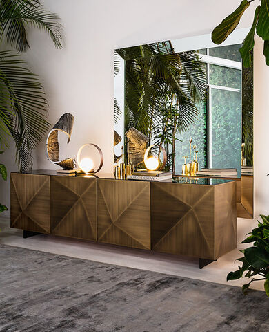With a perfect, regular geometric shape and seamless reflection between frame and mirror, Trapezio stands as an icon of contemporary style. Available in square or rectangular formats, it can be mounted vertically or horizontally, in plain or bronzed mirror glass, offering versatile design options for any interior.