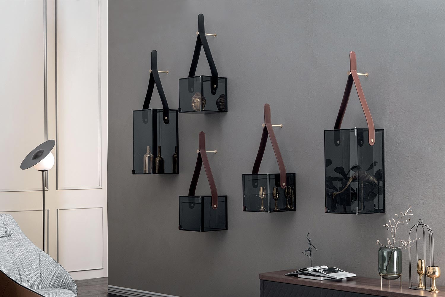 Materials: Crystal glass, leather, brass