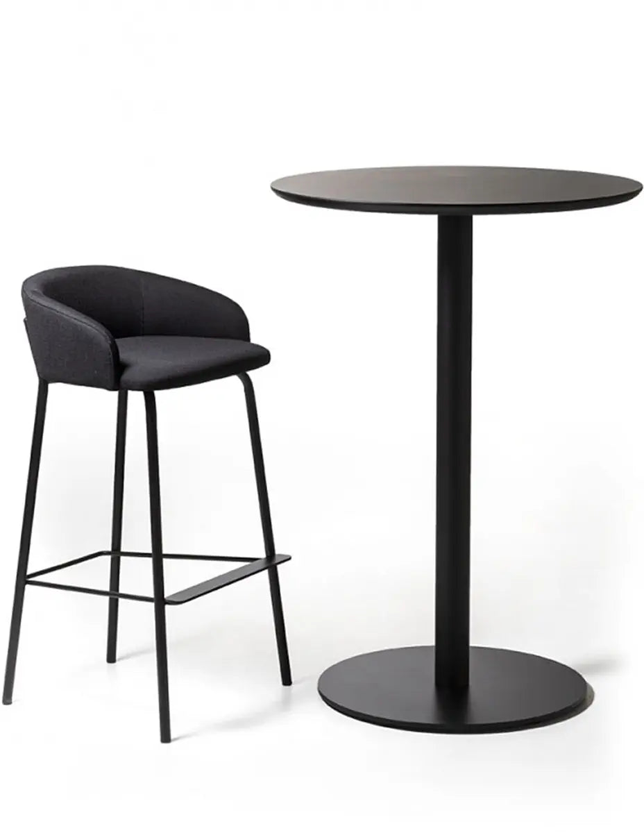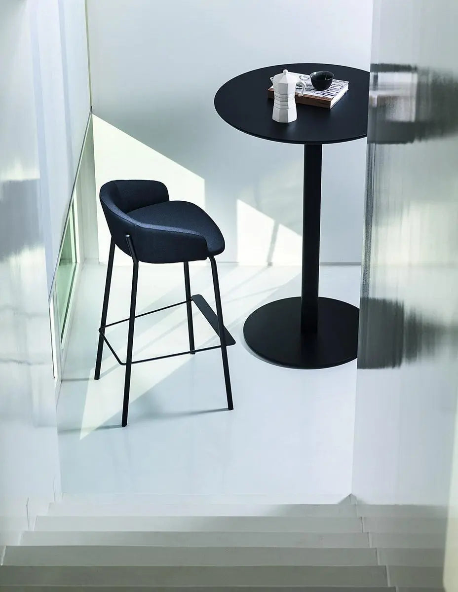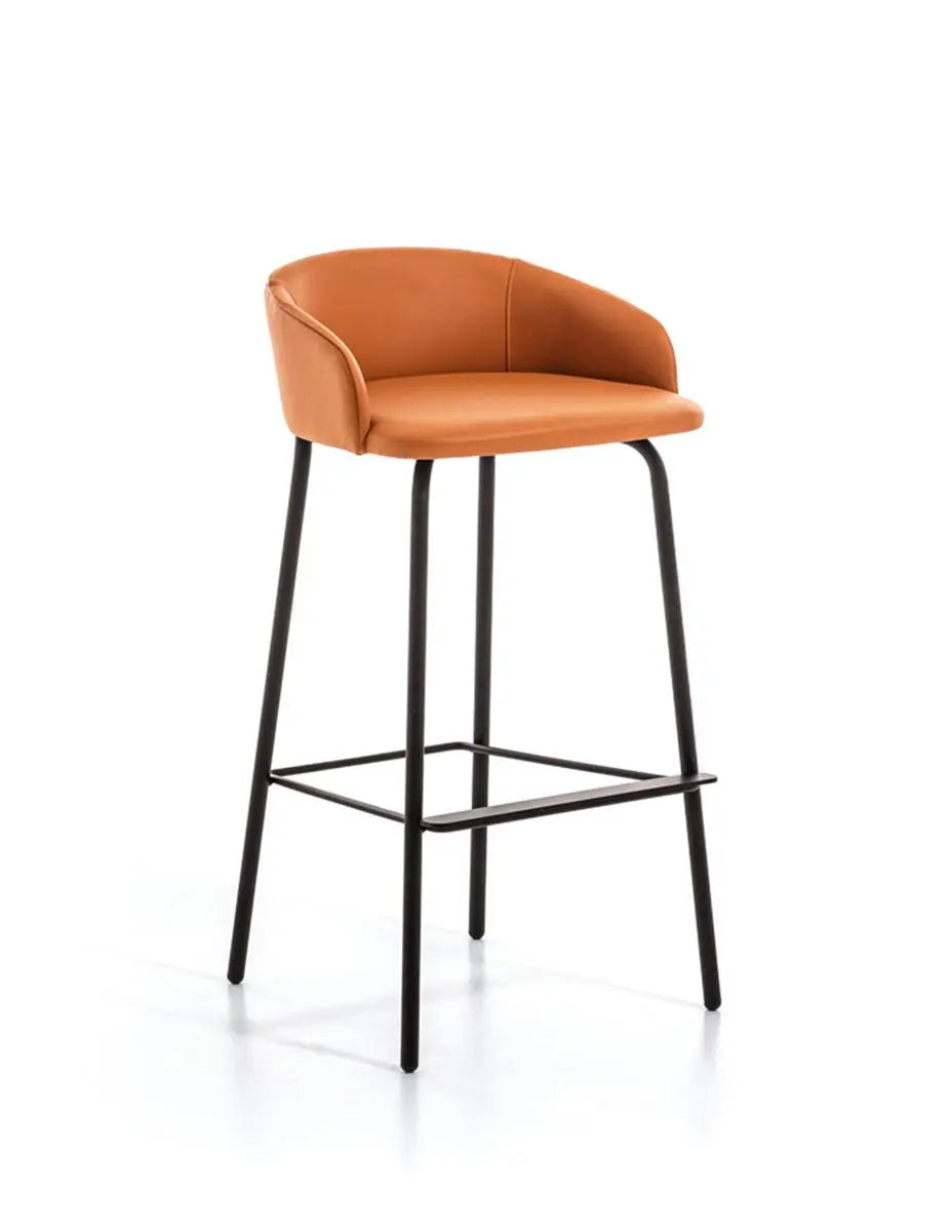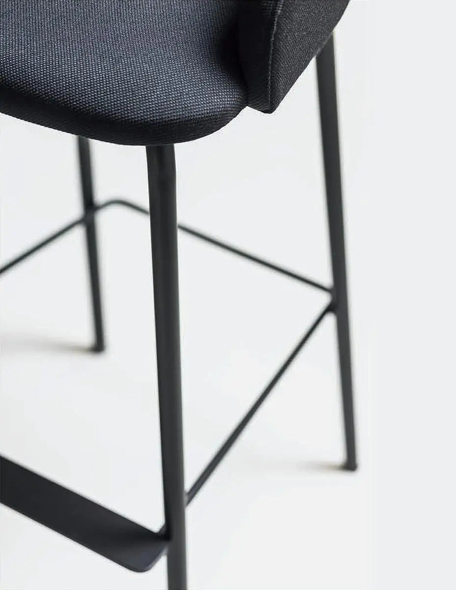 This modern barstool features a fully upholstered shell available in premium fabric or leather, offering a refined and comfortable seating experience. The minimalist design is complemented by a sturdy matte black lacquered metal frame, creating a sleek and contemporary look. Ideal for kitchen islands, bars, or hospitality settings, this barstool blends style, comfort, and durability for both residential and commercial use.