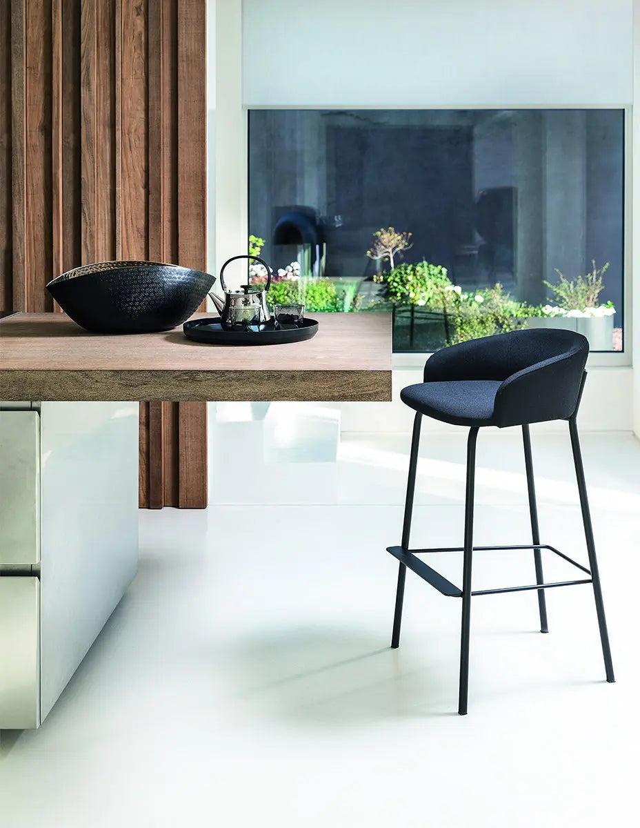 Its minimalist silhouette is anchored by a sturdy matte black lacquered metal frame, adding a contemporary contrast and ensuring long-lasting durability. Designed to integrate seamlessly into kitchen islands, bars, and hospitality environments, this barstool is a versatile piece that elevates both residential and commercial interiors with effortless style.