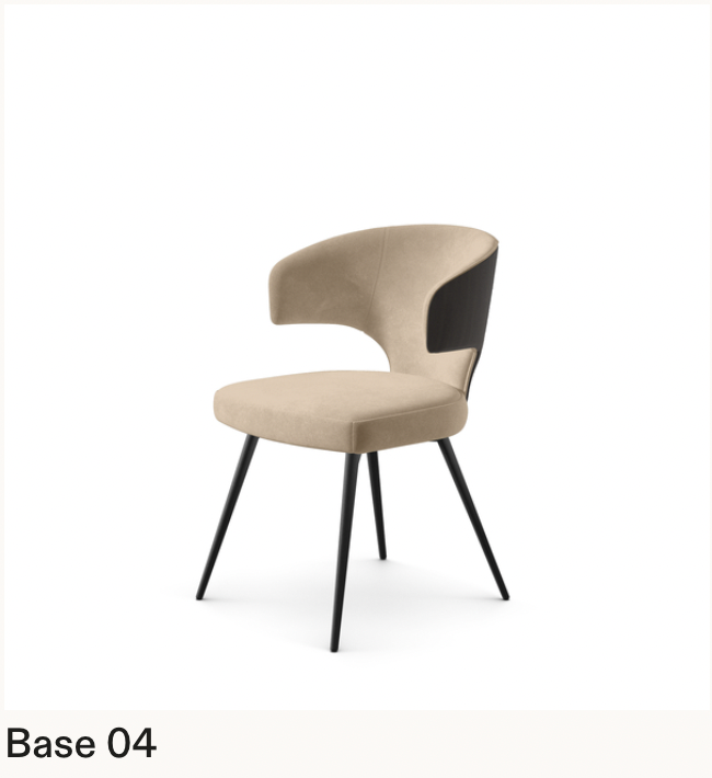 This elegant armchair features a CNC-machined plywood seat and back, padded with high-density foam for lasting comfort. It can be upholstered in your choice of fabric, leatherette, or genuine bovine leather. The outer back is crafted in ash-veneered plywood and available in a range of refined finishes. Multiple base options and finishes are also available to suit any design aesthetic.